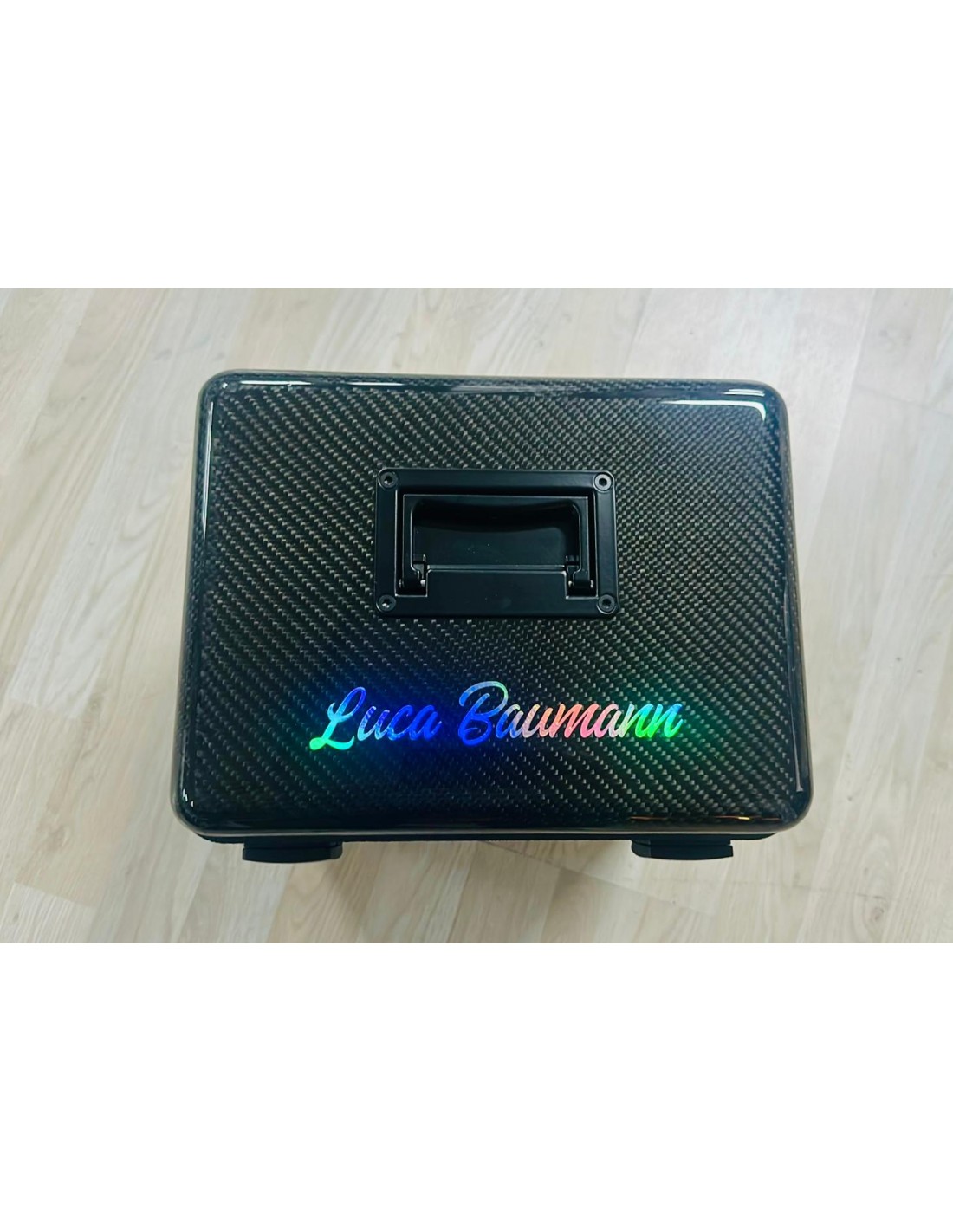 Carbon case Radio personalized. Dimensions: 29,5cm long x 21.5cm width x 27cm hight. Made by Request.